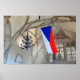 "Drapeau de la République Tchèque au Château de Prague" par Catherine Sherman. Le drapeau de la République tchèque est accroché au plafond voûté de la salle Vladislav, une grande salle dans le complexe du Château de Prague à Prague en République Tchèque. Le drapeau rouge, blanc et bleu ajoute une couleur vive à l'espace historique. Armoiries et fenêtres décoratives rehaussent la grandeur de la pièce. La salle a été utilisée pour de grands événements publics de la monarchie bohème et maintenant dans l'état tchèque moderne. Construit entre 1493 et 1502 par Benedikt Rejt sous le règne de Vladislav II, le hall était le plus grand espace séculaire (62m × 16m × 13m) dans Prague médiévale et est l'un des espaces structuraux et architecturaux les plus complexes de la fin du Moyen Âge. Selon le Livre Guinness des Records, le Château de Prague est le plus grand château ancien du monde, occupant une superficie de presque 70 000 mètres carrés (750 000 pieds carrés), à environ 570 mètres (1 870 pieds) de longueur et une moyenne d'environ 130 mètres (430 pieds) de large. Le château est l'une des attractions touristiques les plus visitées de Prague, attirant plus de 1,8 million de visiteurs par an. Le drapeau de la République tchèque est le même que celui de l'ancienne Tchécoslovaquie. À la dissolution de la Tchécoslovaquie en décembre 1992, la République tchèque a gardé le drapeau tchécoslovaque tandis que la Slovaquie a adopté son propre drapeau. Le premier drapeau de la Tchécoslovaquie était basé sur le drapeau de la Bohême et était blanc sur rouge. C'était presque identique au drapeau de la Pologne (seule la proportion était différente), de sorte qu'un triangle bleu a été ajouté au treuil en 1920.