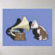 Un chien avec un cône rayé hurle à un ancien lecteur de disque gramophone avec une corne d'entonnoir en laiton. Couleur, ombres pour un effet 3-d agréable, sur t-shirts, affiches, cartes, cadeaux.