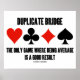 Si vous jouez à double pont, vous apprécierez l'humour de pont wry avec cette affiche avec les costumes de quatre cartes ainsi que le dicton "Pont dupliqué - Le seul jeu où être moyen est un bon résultat". Faites faire aux autres une double prise sur le concept de moyenne et d'arriver à un jeu moyen dans le monde du pont avec ce pont mémorable en disant poster!