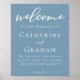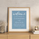 Ce panneau d'accueil bleu poussiéreux respire la tranquillité pour un mariage côtier d'été en bord de mer. Personnalisez ce décor bleu gris clair avec une élégante typographie blanche minimaliste pour assortir votre jeu de couleurs nuptiales sereines.