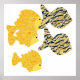 Mosaïque, dessin graphique, avec groupe, à motif rayé, et pochoir, exposé de poissons dans les couleurs vives de ; orange, rouge, jaune, or, taupe, marron, noir et blanc.