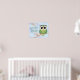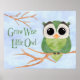Illustration de la chouette "Grow Wise Little Owl" avec effets d'aquarelle mettant en vedette une chouette sur une branche d'arbre et texte "Grow Wise Little Owl". Couleurs bleu, vert, orange et marron.