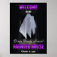 Un fantôme éffrayant et effrayant dans un sombre couloir déplaisant arrière - plan "Bienvenue" à la "Maison hantée". Ajoutez simplement le nom et la date.
