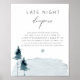 Cette enseigne de jeu de baby shower en fin de soirée est ornée de pins d'hiver bleu ardoise rustique, de éclaboussures d'aquarelle et de polices manuscrites. C'est le signe de baby shower idéal pour votre baby shower boho, rustique, montagnard ou forestier.
