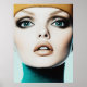 Un portrait en gros plan d'un modèle aux yeux turquoises captivants, accentué par un maquillage des yeux audacieux et des lèvres pleines de tons neutres. Le style vintage et les couleurs riches évoquent l'essence de la mode des années 60, avec une touche d'art moderne. Son regard intense et son expression douce captent l'attrait et le raffinement de l'époque.