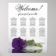 Ce magnifique tableau de sièges mariage comprend 8 tables et présente un design floral moderne et romantique. Un rose royal pourpre à long tige est affiché sur son côté, réfléchissant dans un bassin d'eau, ajoutant à l'élégance du tableau. Le titre, "Bienvenue! s'il vous plaît trouver votre table," est écrit en calligraphie de script élégant, tandis que les noms du couple et la date du mariage sont situés en bas. Avec des places pour 80 personnes et 10 places par table, ce tableau est une façon fantastique d'accueillir les clients et de les aider à trouver leur place à la réception.