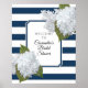 "Élégant Accueil Floral Moderne Rayure Blanche Bleu Marine Affiche Enseigne de Mariage." Un large fond rayé de bleu marine, d'argent et de blanc est associé à des fleurs d'hortensia blanches peintes à la main pour une décoration de mariage moderne et magnifique. L'œuvre a été peinte par Audrey Jeanne Roberts, une artiste et designer licenciée à l'international, copyright.