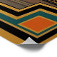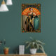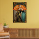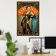 Embrace the peak of Jazz Age elegance with this sophisticated Art Deco portrait of a woman in a beaded gown. With a rich teal and gold color palette, she is positioned against a massive orange sunburst fan. Opulent geometric borders frame this piece, making it an ideal choice for a luxury dressing room, bedroom, or boutique setting.