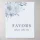 Invitations amis et famille à prendre une faveur avec cette enseigne élégante, avec des fleurs bleues foncées sur un arrière - plan bleu poussiéreux.