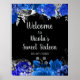 Pretty birthday welcome sign with royal blue flowers and silver foliage. The words can be changed to suit your own details or requirements. Would be perfect for a sweet sixteen birthday party.