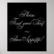 Ce panneau romantique et intemporel "Please Find Your Seat : Bon Appetite" ajoute une élégance simple à toute réception de mariage classique, douche ou motif de fête. Le luxueux modèle de script dispose d'une superbe calligraphie blanche moderne et fantaisie sur arrière - plan noir. La belle police avec une couleur arrière - plan personnalisable permet de s'adapter facilement à n'importe quel thème. Pour d'autres couleurs ou produits correspondants, veuillez visiter le magasin JustFharryn Zazzle, ou contacter le concepteur, c/o Fharryn@yahoo.com Tous droits réservés. #zazzlemade