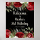 Pretty birthday welcome sign with red flowers and green foliage. The words can be changed to suit your own details or requirements. Would be perfect for a birthday party.