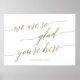 Cette élégante calligraphie dorée, heureuse d'être ici, affiche de date mariage, est parfaite pour un simple mariage. Le design neutre présente une enseigne minimaliste décorée de typographie romantique et fantaisiste en feuille d'or.