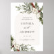 Bienvenue à votre mariage avec ce magnifique panneau, avec un cadre de fleurs d'hiver et d'élégants verdures. Ajoutez le nom du client d'honneur, la date de la douche et le texte de bienvenue personnalisé en utilisant les champs fournis.