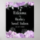Pretty birthday welcome sign with lilac purple flowers and silver foliage. The words can be changed to suit your own details or requirements. Would be perfect for a sweet sixteen birthday party.