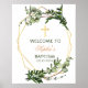 Élégante Affiche de bienvenue Baptême. Ce design branché est doté d'éléments botaniques de verdure aquarelle et d'un cadre doré géométrique.