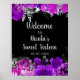 Pretty birthday welcome sign with purple flowers and silver foliage. The words can be changed to suit your own details or requirements. Would be perfect for a sweet sixteen birthday party.