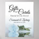 Ce magnifique panneau permettra à vos invités mariages de savoir où ils devraient laisser leurs cadeaux et leurs cartes. Dispose d'un design élégant et élégant avec un seul rose à long tige bleu poussiéreux ou bleu poudreux pâle réfléchissant ou reflété dans un bassin d'eau. Il y a un court message de remerciement ainsi que les noms du couple.
