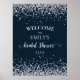 Élégant panneau de bienvenue de shower de mariage bleu marine avec des confettis diamants argentés scintillants. Contactez-nous pour obtenir de l'aide sur la personnalisation ou les produits correspondants.