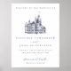 This wedding welcome poster features a vintage illustration of a castle, which you can replace with an image of your destination wedding venue. Elegant dark blue lettering in serif and script fonts lay out the bride and groom names, and details of the wedding, including the location and date.