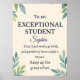 Célébrez un élève vraiment exceptionnel avec cette carte de félicitations élégante, conçue pour les enseignants, les écoles et les parents fiers qui veulent honorer le succès scolaire d'une manière significative. Doté d'un arrière - plan de style parchemin doux avec feuilles d'aquarelle et accents d'or, cette carte vous transmet un message sincère : "À un ÉTUDIANT EXCEPTIONNEL - Votre travail acharné, votre croissance et votre positivité ont eu un impact. Continuez à faire de grands efforts." 🎓 Ajoutez le nom de votre élève pour créer un souvenir personnalisé qu’ils chériront. Qu’il s’agisse de remise de diplômes, de remise de prix de fin d’année ou de reconnaissance en classe, cette carte est la meilleure façon de dire "Je vois vos efforts, et je suis fier". Le design est idéal pour les garçons et les filles ados, et le champ de nom est entièrement modifiable pour convenir à tout étudiant ou occasion.