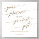 Cette élégante calligraphie or votre présence est notre plus grand poster cadeau est parfait pour un mariage simple. Le design neutre présente une carte minimaliste décorée avec une typographie romantique et fantaisiste de feuille d'or. Remarque : Ce design ne comporte pas de véritable feuille d'or. C'est un graphisme de haute qualité fait pour ressembler à du papier doré.
