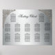 Un très somptueux tableau de sièges de réception de mariage argenté, ce tableau présente un thème argenté avec un arrière - plan en dégradé d'argent derrière les noms des invités, et une paire de coins en dentelle argentée très complexes et décoratifs en haut.