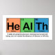 Les éléments du Tableau périodique (Hélium, Aluminium et Thorium) décrivent ainsi la "SANTÉ". La définition de la santé se trouve sous "Un état de bien-être physique, chimique et social complet, et pas seulement l'absence de maladie ou d'infirmité".