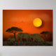 Conception de coupures de papier avec un troupeau d'éléphants dans la savane africaine au coucher du soleil.