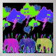 Néon éléphants sur arrière - plan noir avec nuages, éclairs, musique et coeurs.
