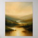 Une peinture à l'huile sereine et éthérée représentant un lac tranquille niché entre des collines douces et ondulantes. Le ciel est une teinte d'or et d'ambre chaude, projetant une douce lueur qui se reflète parfaitement sur l'eau calme en dessous. L'atmosphère brumeuse brouille le paysage lointain, créant une qualité onirique et un sentiment de paix et de solitude. Les coups de pinceau sont doux et mélangés, mettant l'accent sur l'harmonie et la beauté tranquille de la nature.
