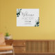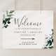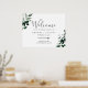 Cette affiche d'accueil mariage de verdure émeraude est parfaite pour un mariage boho. Le design élégant et rustique présente des feuilles d'aquarelle vert foncé moody et des eucalyptus aux tons bohèmes modernes. Customisez l'affiche avec le nom de la mariée et du marié, et la date du mariage.