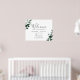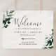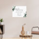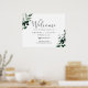 Cette affiche d'accueil mariage direction verdoyante émeraude est parfaite pour un mariage boho. Le design élégant et rustique présente des feuilles d'aquarelle vert foncé moody et des eucalyptus aux tons bohèmes modernes. Customisez l'affiche avec le nom de la mariée et du marié, et la date du mariage.