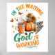 Design paisible et coloré avec une scène automne/automne avec un citrouille, tasse de café, papillons et fleurs automne. Le texte inspirant et coloré dit : "Dans l'attente Dieu fonctionne". Ce design est disponible sur une grande variété de produits.