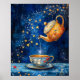 Step into a moment of everyday magic with this enchanted tea service wall art. The whimsical art poster print features a beautifully decorated teapot pouring a glowing stream of tea into an ornate teacup, while golden stars drift through a deep celestial night sky.
