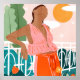 Une femme se penche, s'imprégnant de la lumière du soleil, entourée de verdure luxuriante et de fleurs en fleurs. Des pastels douces et des oranges audacieuses créent une ambiance estivale rêveuse et détendue. La scène saisit un moment paisible de chaleur tranquille et de beauté sans effort.