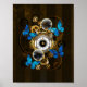 Composition de l'horloge ronde steampunk avec cadran romain noir, décoré avec des engrenages or et laiton, papillons Morpho bleu et lentilles endommagées sur arrière - plan rayé brun. Style Steampunk.