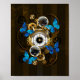 Composition de l'horloge ronde steampunk avec cadran romain noir, décoré avec des engrenages or et laiton, papillons Morpho bleu et lentilles endommagées sur arrière - plan rayé brun. Style Steampunk.