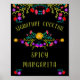 Enseigne de bar à cocktails de signature avec thème de fiesta mexicaine, que vous pouvez personnaliser avec votre choix de cocktail, tel que Spicy Margarita. Cette conception florale colorée présente des fleurs d'art populaire mexicain dans des couleurs vives sur fond noir, avec une typographie fantaisiste vert lime.