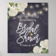 Modèles d'affiche de bienvenue pour la réception de mariage - Fleurs d'hortensia blanches élégantes et guirlandes lumineuses sur fond de lin floral bleu marine vintage.