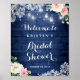Enseigne d'affiche de mariage fleurie avec guirlande lumineuse et pot Mason bleu rustique.
