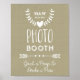Affiche de photobooth de mariage avec un motif de toile de jute rustique et une couronne de laurier vintage avec une flèche et une illustration avec des cœurs et un texte en lettrage main et monogramme.