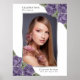 Élégante enseigne de bienvenue pour célébration de vie/funérailles avec photo florale violette comprenant des roses violettes et des fleurs de baby's breath ornant une photo dans un cadre argenté. Articles assortis disponibles.
