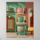 Un empilement ludique de télévisions anciennes dans des tons pastel doux crée un point focal nostalgique dans un intérieur stylé du milieu du siècle. Le mélange de teintes menthe, crème et corail chaud complète les meubles et la décoration environnants. Des lignes épurées, des écrans arrondis et des cadrans classiques évoquent une époque de design intemporel, mêlant technologie rétro et attrait esthétique moderne dans une composition équilibrée et accrocheuse.