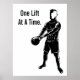Un vecteur en noir d'un homme mince et en forme faisant des levées avec un poids de kettlebell. L'espace négatif est utilisé pour les contours. Le texte se lit "Un levé à la fois" qui est un rappel qu'il n'y a pas de raccourci vers la forme physique et être mince et avoir bonne mine. Un changement n'est possible qu'à chaque effort fourni. Vous pouvez également personnaliser votre propre message.