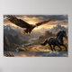 Dans la grandeur silencieuse des montagnes, deux chemins se déploient à la fois. Haut au-dessus des falaises, un aigle doré glisse dans l'air ouvert, ailes tendues, tandis que la lumière du soleil caresse le bord de ses plumes. En bas, le long d'un étroit sentier taillé dans un terrain accidenté, un cheval noir court avec une grâce puissante, son mouvement résonnant à travers les parois du canyon.