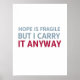 Un design minimaliste qui capture la résilience face à l'incertitude. La citation "L'ESPOIR EST FRAGILE MAIS JE LE PORTE DE TOUTE FAÇON" est un rappel puissant que la force ne réside pas dans la solidité de l'espoir lui-même, mais dans l'engagement indéfectible de s'y tenir malgré sa délicatesse. Les couleurs contrastées (gris/bleu et rouge gras) mettent l'accent sur la lutte interne et la décision de persister.