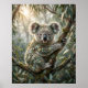 A charming eucalyptus koala rests peacefully among misty branches high in a forest canopy. Realistic koala features blend with silvery eucalyptus leaves, bark textures, soft fur, and delicate botanical accents. Filtered sunrise light and drifting fog create a fresh, calming atmosphere full of warmth and serenity. This adorable premium design brings comfort and natural beauty to nurseries, bedrooms, wellness spaces, or gift collections. Perfect for koala lovers, Australian wildlife fans, and soothing nature decor themes.
