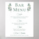 Un script de calligraphie verte simple et élégant avec deux feuilles d'eucalyptus d'aquarelle de chaque côté en haut autour du titre du menu du bar. Une belle affiche minimaliste de menu de boissons d'automne avec votre liste détaillée de vin, bière, spiritueux et boissons non alcoolisées. Décor chic et moderne mariage du soir pour un jardin en soirée.