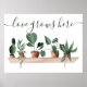 Citation d'amour moderne maison plante aquarelle illustration avec différents plantes peints sur une étagère, cactus, monstère, et d'autres succulents. Une touche tropicale et exotique avec une citation éditable disant amour grandit ici dans une calligraphie script élégante et moderne.